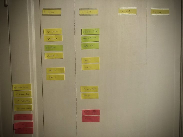 ②上から順番にタスクをこなしていきます。一度に複数のタスクに手を付けていいことにしているので「進行中」欄には複数の付箋があることも多々。